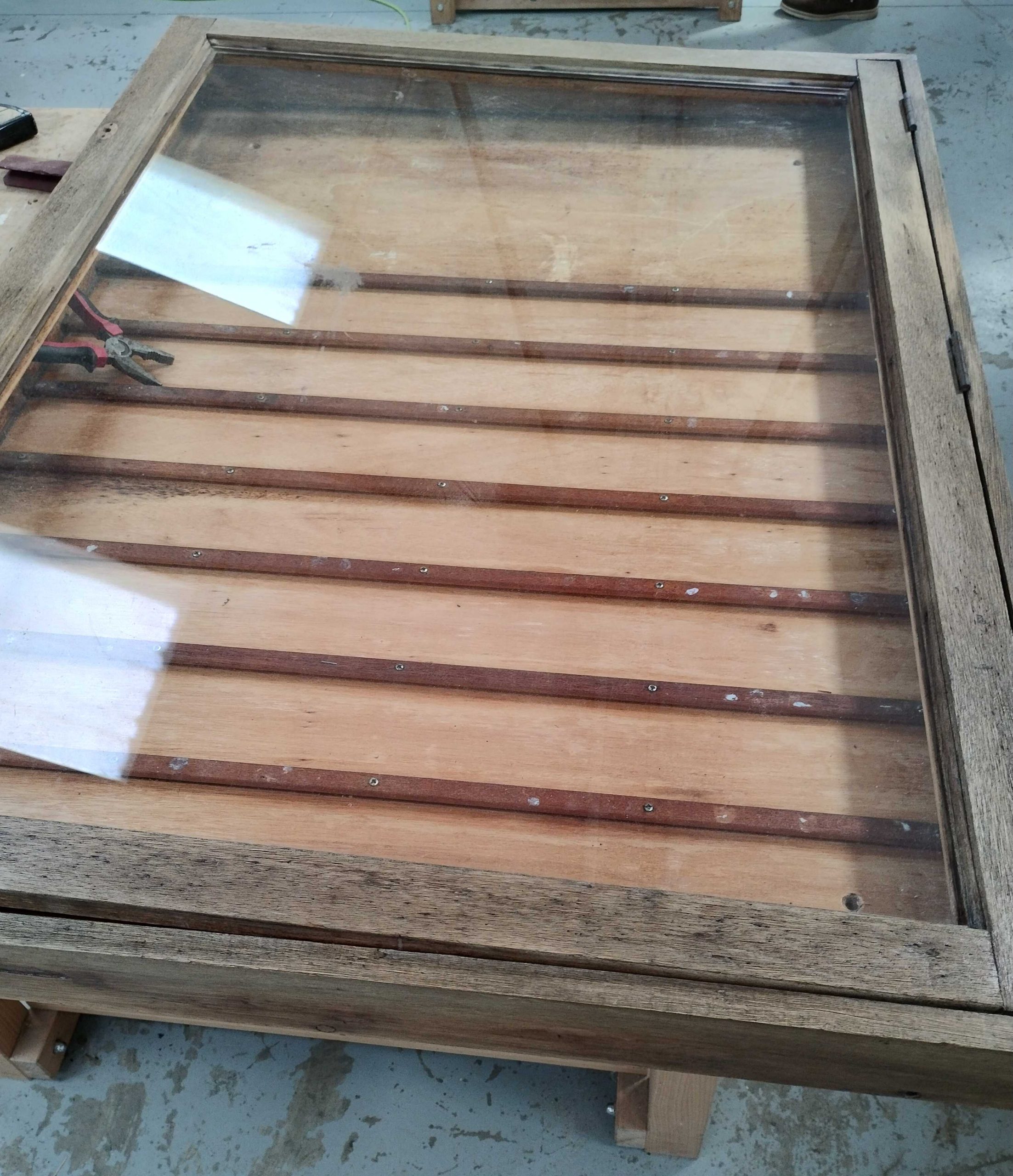 Delivery to the school workshop was arranged and work began to clean the outside and inside up, removing old staples, etc. Then the exterior was given multiple coats of varnish and the joints were strengthened.